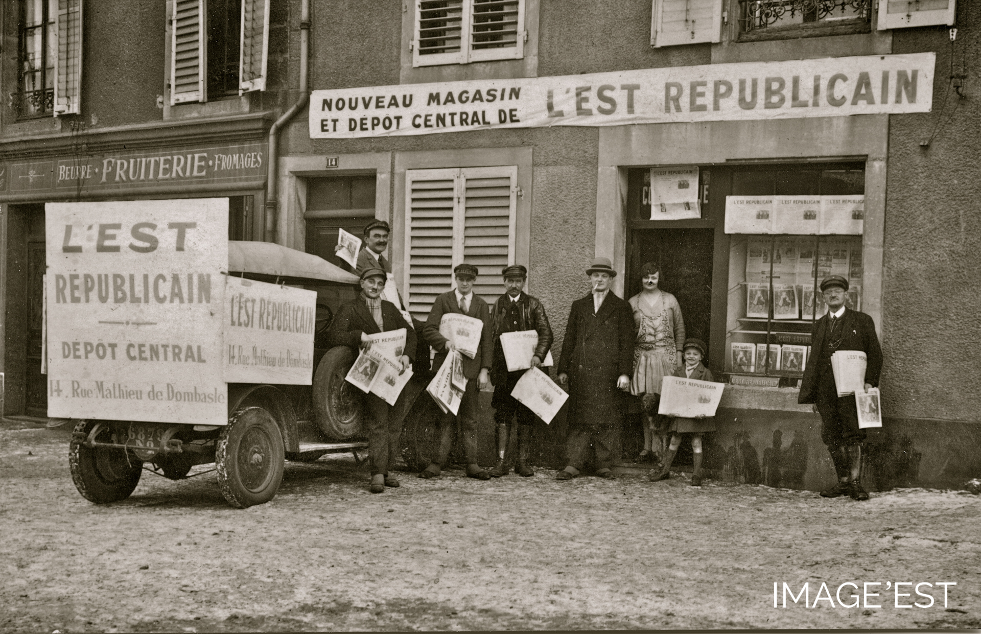 Dépôt central du journal L'Est républicain 14, rue Mathieu de Dombasle à Dombasle-sur-Meurthe (Meurthe-et-Moselle) en 1927. A cette date, la famille Sars tient le nouveau magasin qui sera repris plus tard par M. François Henry. Sur le pas de la porte, M. Sars en compagnie de son épouse et leur enfant tenant un journal.