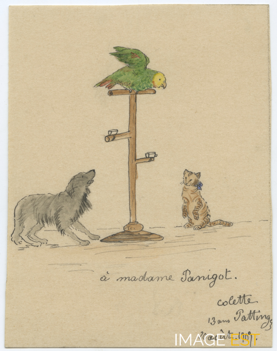Dessin réhaussé de couleur, réalisé par l'illustratrice Colette Pattinger (1896-1940?), représentant un perroquet sur un perchoir, un chat et un chien. Une inscription manuscrite mentionne : " à Madame Panigot. Colette Pattinger 13 ans 20 août 1909 ".