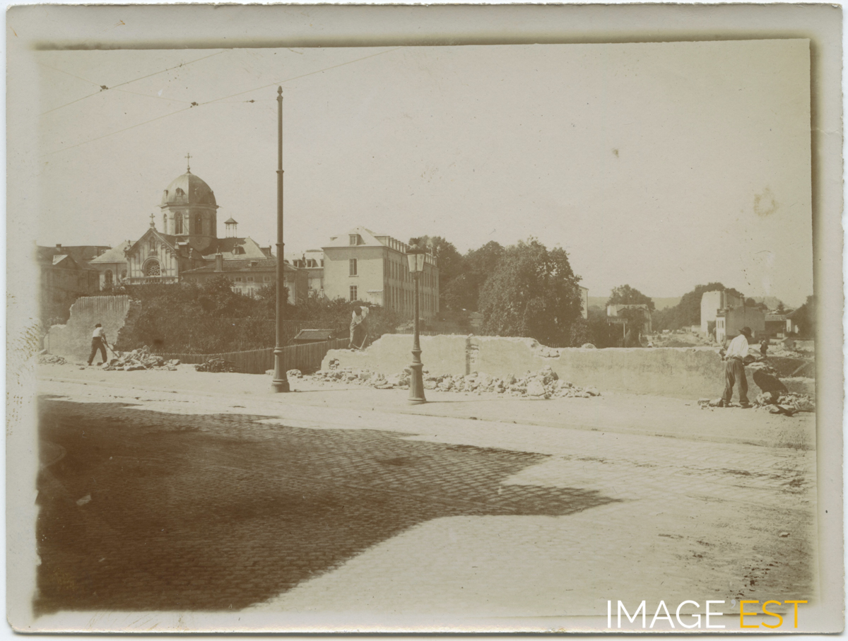 Destruction d'un mur longeant l'ancienne rue de Toul (actuelle avenue de la Libération) au niveau du square Godefroy-de-Bouillon à Nancy (Meurthe-et-Moselle). À l'arrière-plan, on distingue le pensionnat Saint-Joseph fondé en 1874. Sur cet emplacement sera édifiée en 1964, la faculté de Lettres. Une mention manuscrite au verso de cette photographie précise : " 29 juin 1908 ".