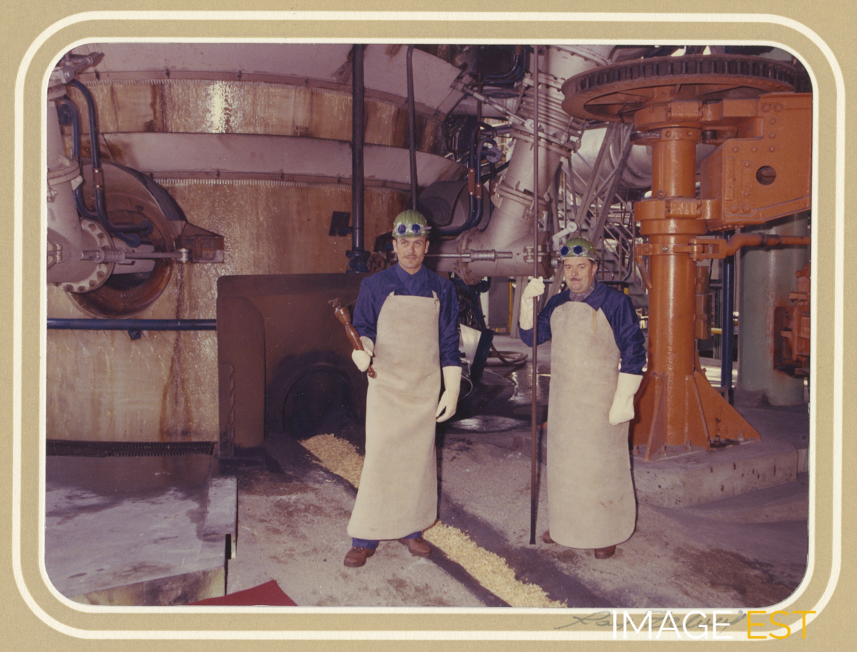 Sidérurgistes tenant une torche de mise à feu d'un haut fourneau lors d'une visite d'officielle de l'usine de la " Société des hauts-fourneaux et fonderies de Pont-à-Mousson " à Pont-à-Mousson (Meurthe et Moselle). Le nom du photographe est noté au crayon en bas à droite : Ray Delvert (1914-1992). Au verso, le cachet "photo "Ray Delvert - 47- Villeneuve-s-Lot - tél.600 Cliché n° E - 5 ".