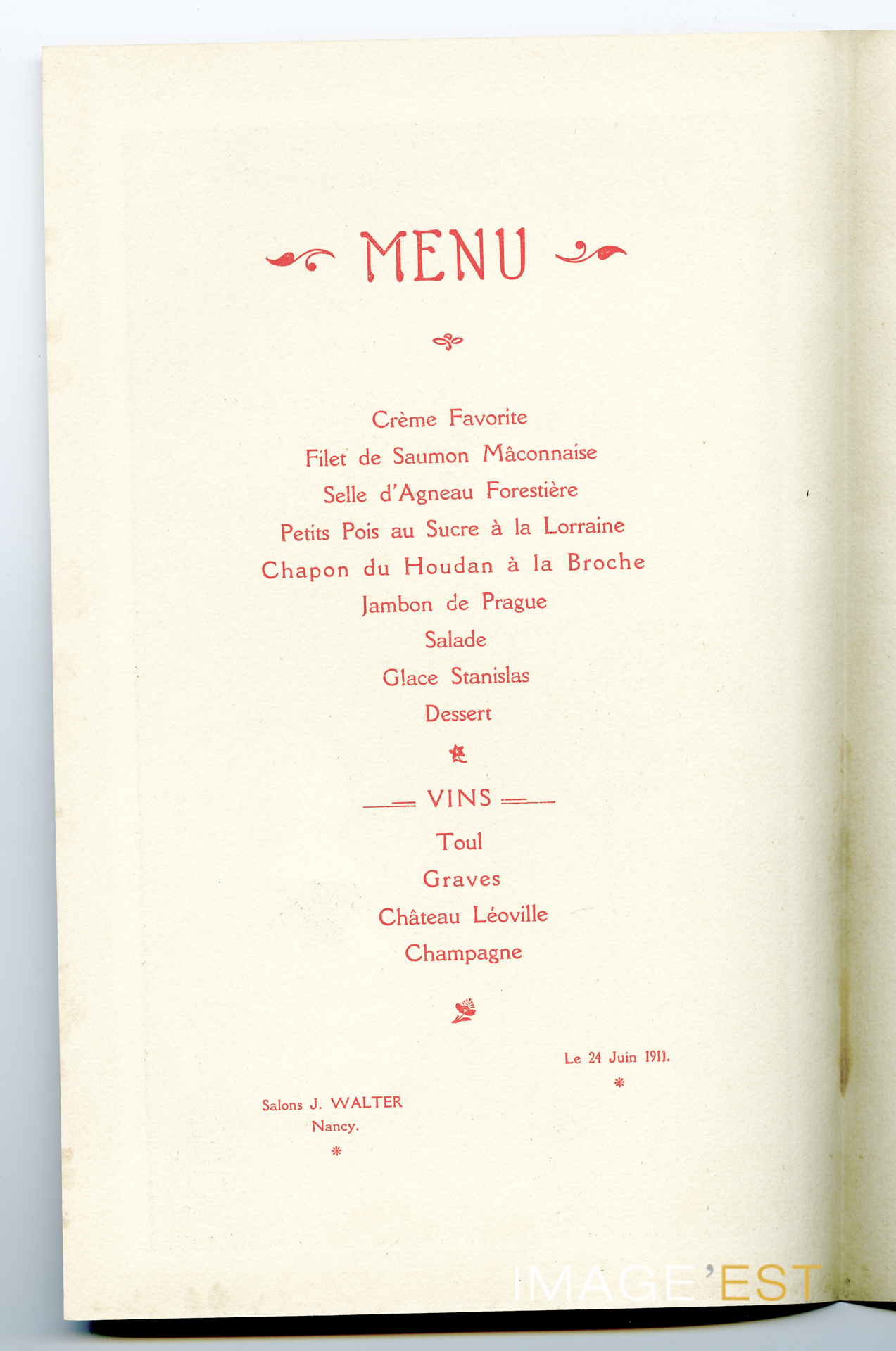 Menu d'un dîner offet par le Couarail, Académie Lorraine, en l'honneur de ses lauréats de 1910 et 1911 et de son ami Hansi, sous la présidence de M. Maurice Barrès, de l'Académie française, président d'honneur du Couarail, au restaurant Walter, place Stanislas à Nancy (Meurthe-et-Moselle) le 24 juin 1911.