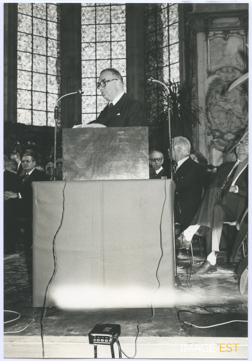 Discours de M. Jean Moreau (1901-1982), président de la Chambre de commerce et de l'industrie de (Meurthe-et-Moselle) à l'abbaye des Prémontrés à Pont-à-Mousson (Meurthe-et-Moselle) probablement en 1976.