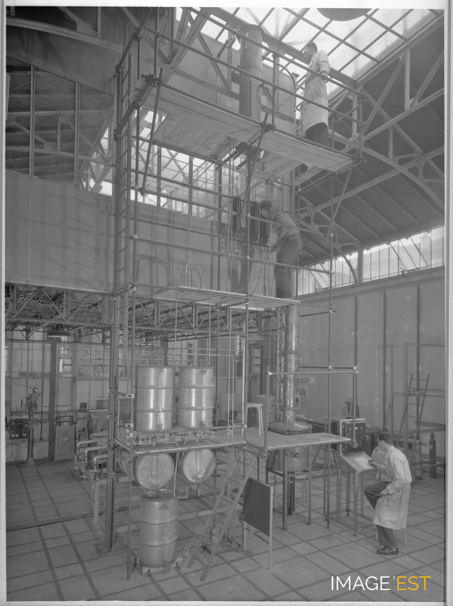 Atelier de distillation de l'École nationale supérieure des industries chimiques (ENSIC) à Nancy (Meurthe-et-Moselle). Une mention manuscrite au verso précise : " Distillation ".