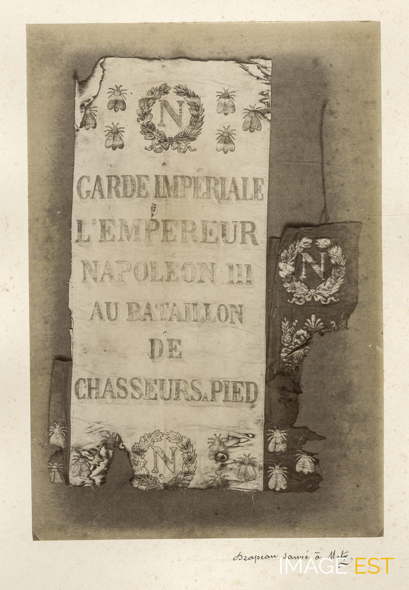 Drapeau de la Guerre franco-allemande de 1870-1871 sauvé à Metz (Moselle) sur lequel figure l'inscription : " Garde Impériale. L'empereur Napoléon III au bataillon de Chasseurs à pied ". Cette photographie est extraite d'un album intitulé " J. D. 1889 " comprenant 75 tirages albuminés contrecollés sur carton, pris par le lieutenant-colonel Joseph Jules Delarue (1839-1925), commandant le 50e régiment territorial d'infanterie de Nancy et membre actif de la prestigieuse Société Lorraine de Photographie (fondée à Nancy en 1894) à laquelle il adhère en 1895 (Bulletin de la Société Lorraine de Photographie, n°3 septembre 1895).