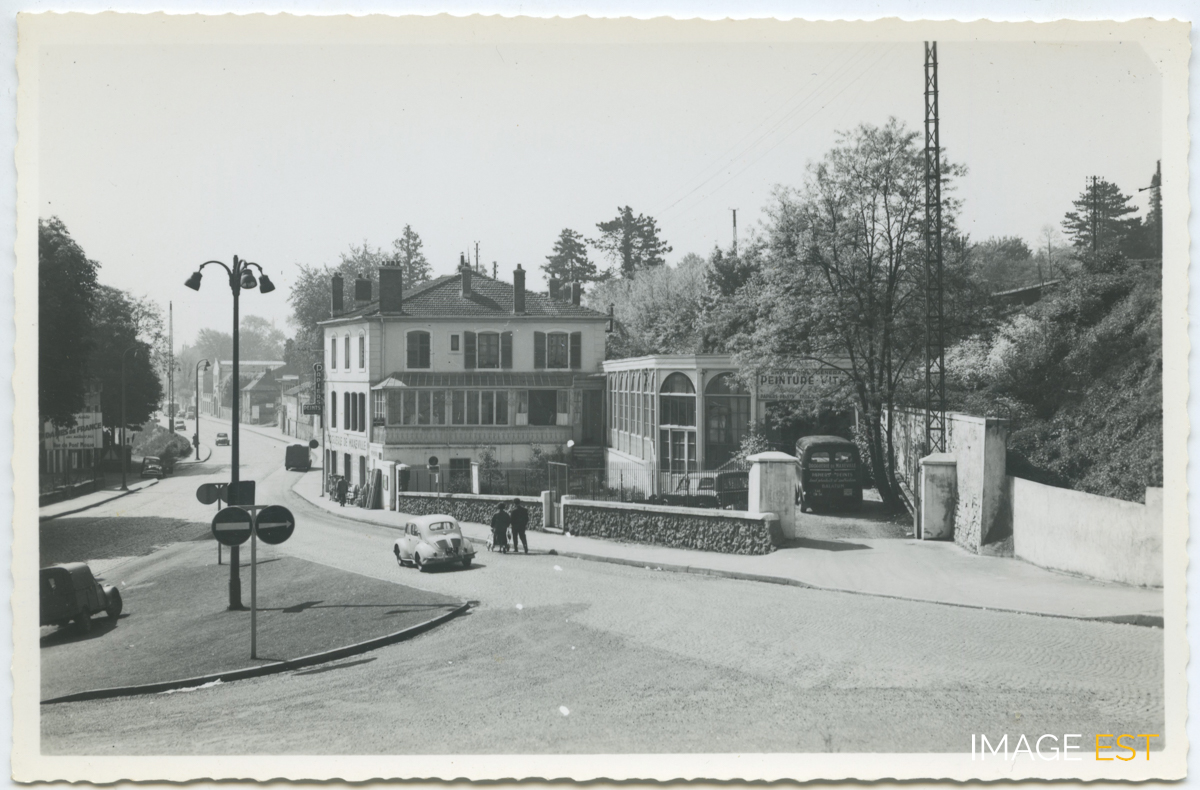 Route de Metz, encore toute pavée, en face de la brasserie Tempo (futur Trianon) la droguerie de M. Kompan. Cette maison abritait auparavant le studio de photographe Octave, après M.Kompan se sera l'entreprise Falchi & Cie et le magasin EFAL, filiale de la galerie d'art EFAL de Saint-Dié. À l'arrière-plan on remarque la devanture des ateliers Neiss et la brasserie-cinéma Michaut devenue un garage. À noter le panneau publicitaire " Dames de France ".