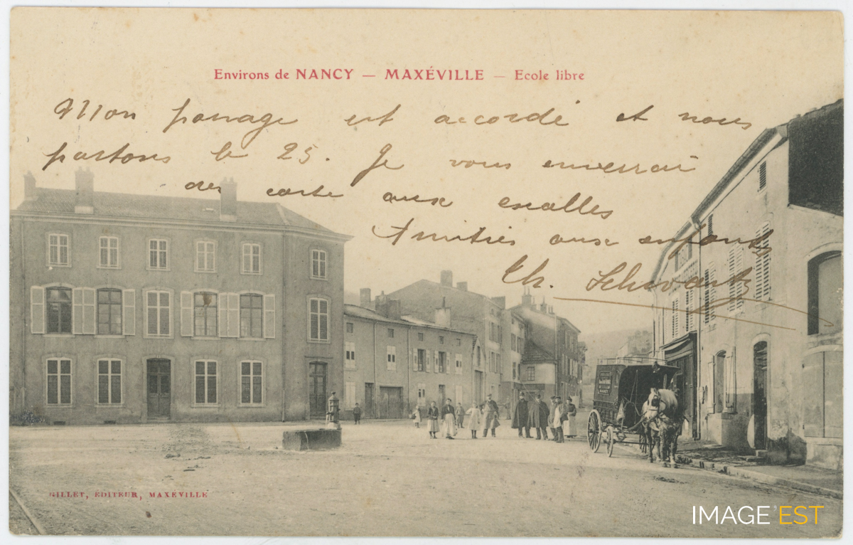 École libre à Maxéville (Meurthe-et-Moselle) au début du XXe siècle siècle.Au centre, une fontaine. À droite, un véhicule hippomobile de livraison en présence de plusieurs commerçants.