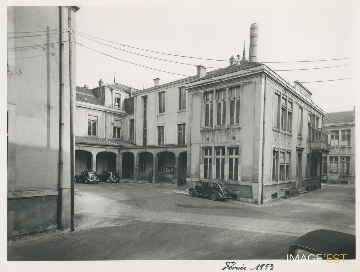 Cour de l'École nationale supérieure des industries chimiques (ENSIC) à Nancy (Meurthe-et-Moselle). Cette photographie est extraite d'un album noir, format à l'italienne (21,5 x 33 cm) et porte la légende suivante : " Février 1953 ". Sur un calque figure une autre mention : " ENSIC - Cour intérieure, amphithéâtre Haller ".
