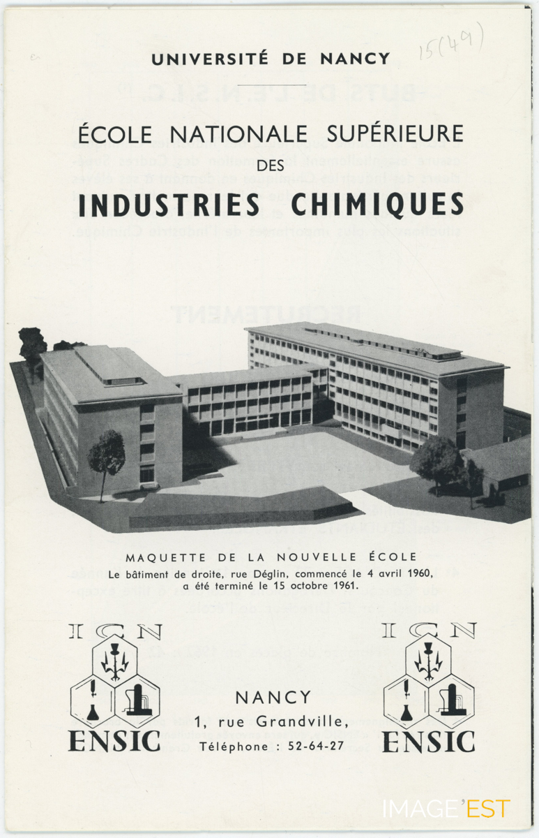 Plaquette de présentation de l'École nationale supérieure des industries chimiques de Nancy en 1961. Le bâtiment de droite, rue Déglin, commencé le 4 avril 1960, a été terminé le 15 octobre 1961.