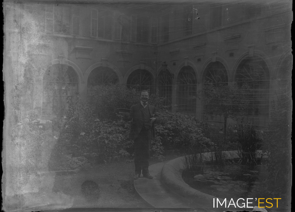 Homme à proximité du bassin d'eau dans la cour de l'ancienne École supérieure de Pharmacie, rue de la Ravinelle à Nancy (Meurthe-et-Moselle).