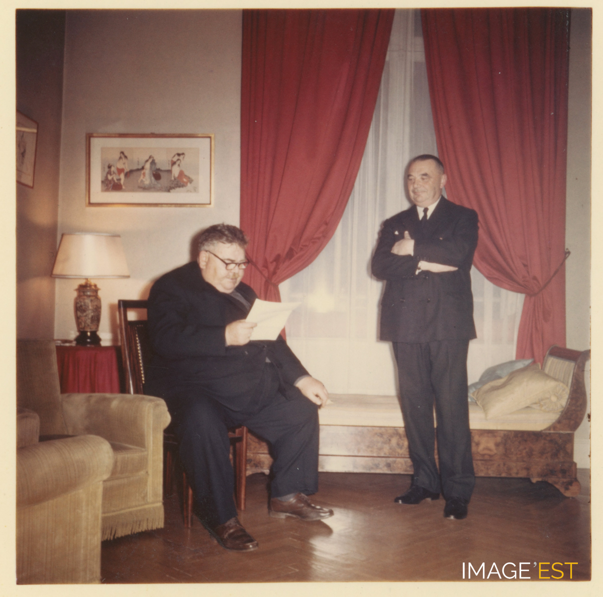 Edmond Charles Urion (1904-1966), directeur de l'École de Brasserie de l'École nationale supérieure des industries chimiques (ENSIC) de Nancy (Meurthe-et-Moselle), lors de la remise de la Légion d'honneur à M. Jean Moreau (1901-1982) à Saint-Nicolas-de-Port (Meurthe-et-Moselle). (Source : Archives privées des familles Kalis-Moreau).