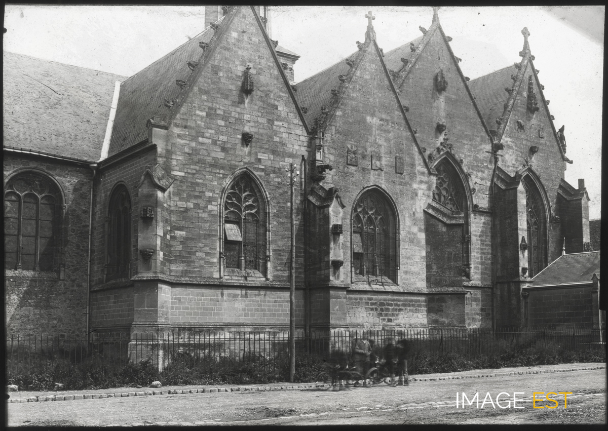 Chapelles à murs-pignons de l'église paroissiale Notre-Dame à Attigny (Ardennes). L'édifice a été fortemment endommagé par les bombardements des deux dernières guerres mondiales (Source : https://inventaire-chalons.grandest.fr)