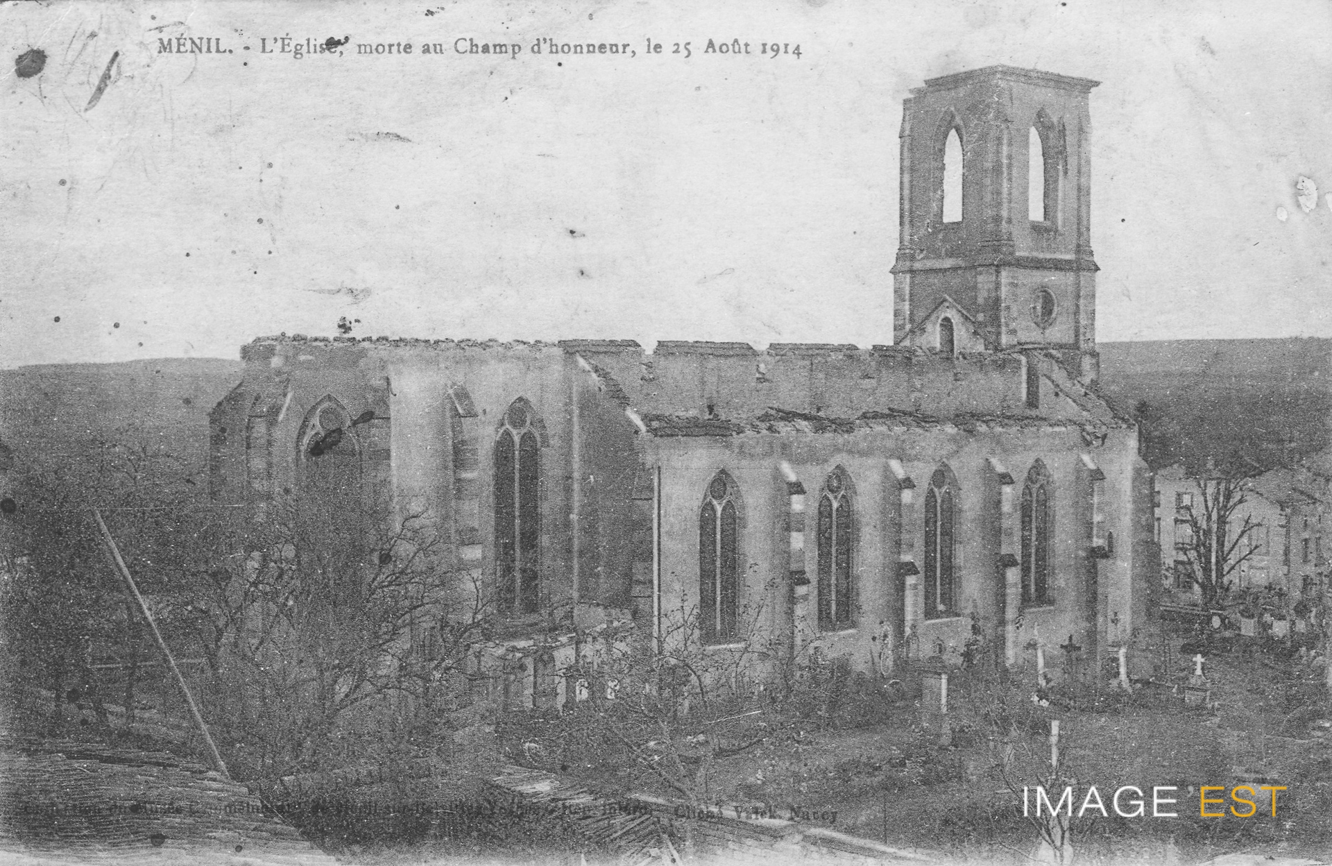 "Ruines de l'église de Ménil-sur-Belvitte (Vosges) après les bombardements de la Première Guerre mondiale. Au premier plan, le cimetière communal. La légende originale de cette carte postale précise : " L'église, morte au champ d'honneur, le 25 août 1914 "."
