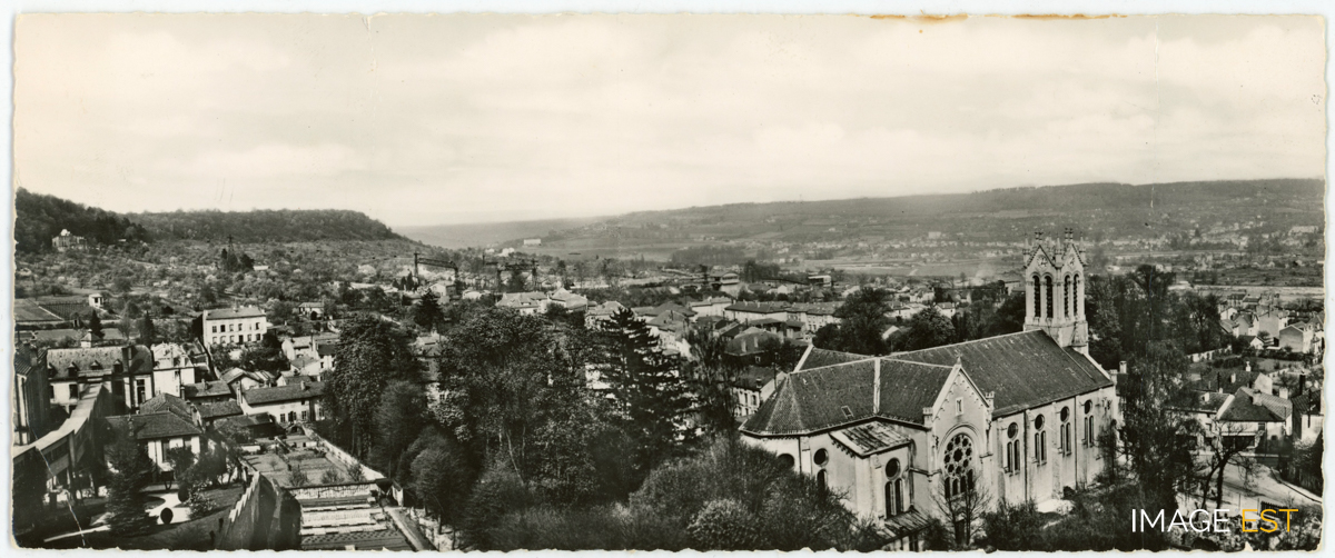 Église et panorama de Maxéville (Meurthe-et-Moselle) avant la construction du viaduc de l'autoroute qui défigura la commune. À l'arrière-plan, des pylônes du transportseur aérien des carrières Solvay.