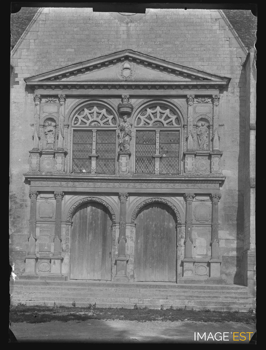 Vue du portail occidental Église Saint-André à Saint-André-les-Vergers (Aude), dit «Maraichers» avec ses trois statues du XVIe siècle : Sainte Savine, saint André et saint Frobert