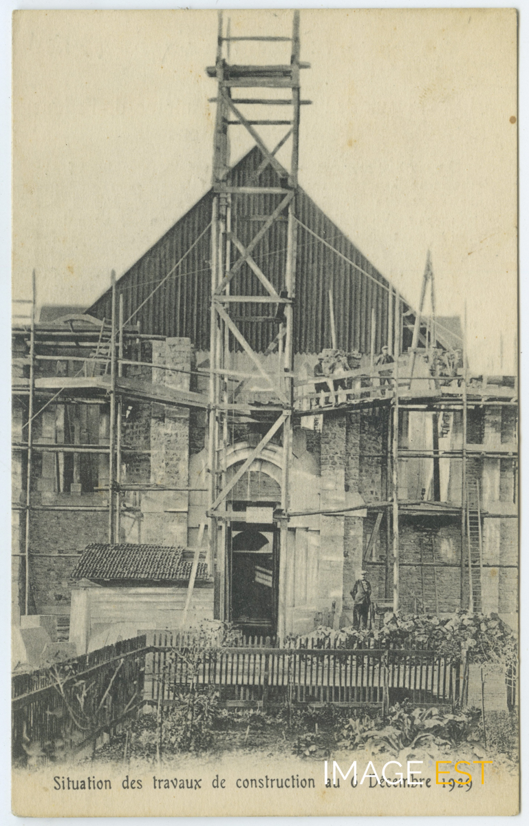 Situation des travaux de construction de l'église Saint-Antoine de Padoue à Neuves-Maisons (Meurthe-et-Moselle) au 6 décembre 1929.