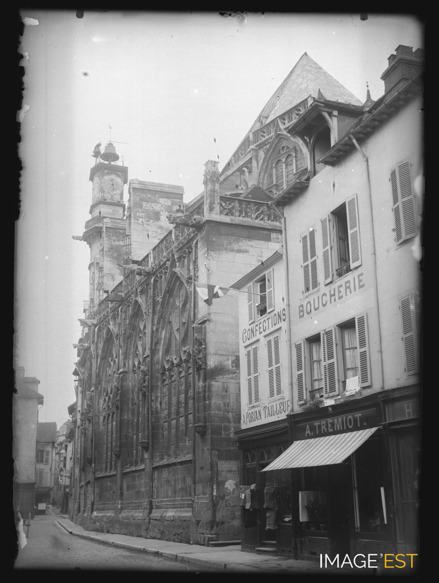 Photographie de l'Église Saint-Jean-au-Marché à Troyes (Aube) et de différentes boutiques prise depuis la rue Urbain IV.