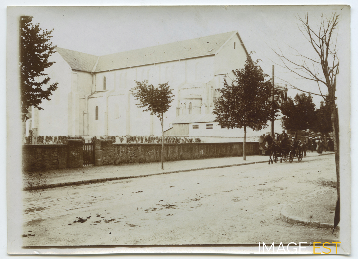 Vue d'ensemble de l'église Saint-Livier à Saint-Max (Meurthe-et-Moselle), le 19 juin 1904. Une mention manuscrite au verso de cette photographie précise : " J.Z. N° 388 - ST MAX - 19 juin 1904 - Bénédiction de l'Eglise St Livier - (c) Vue d'ensemble - (difficile a prendre a cause des arbres) - I - E ". Présence d'une calèche et de personnes devant le parvis de l'église sur la droite de la photographie.