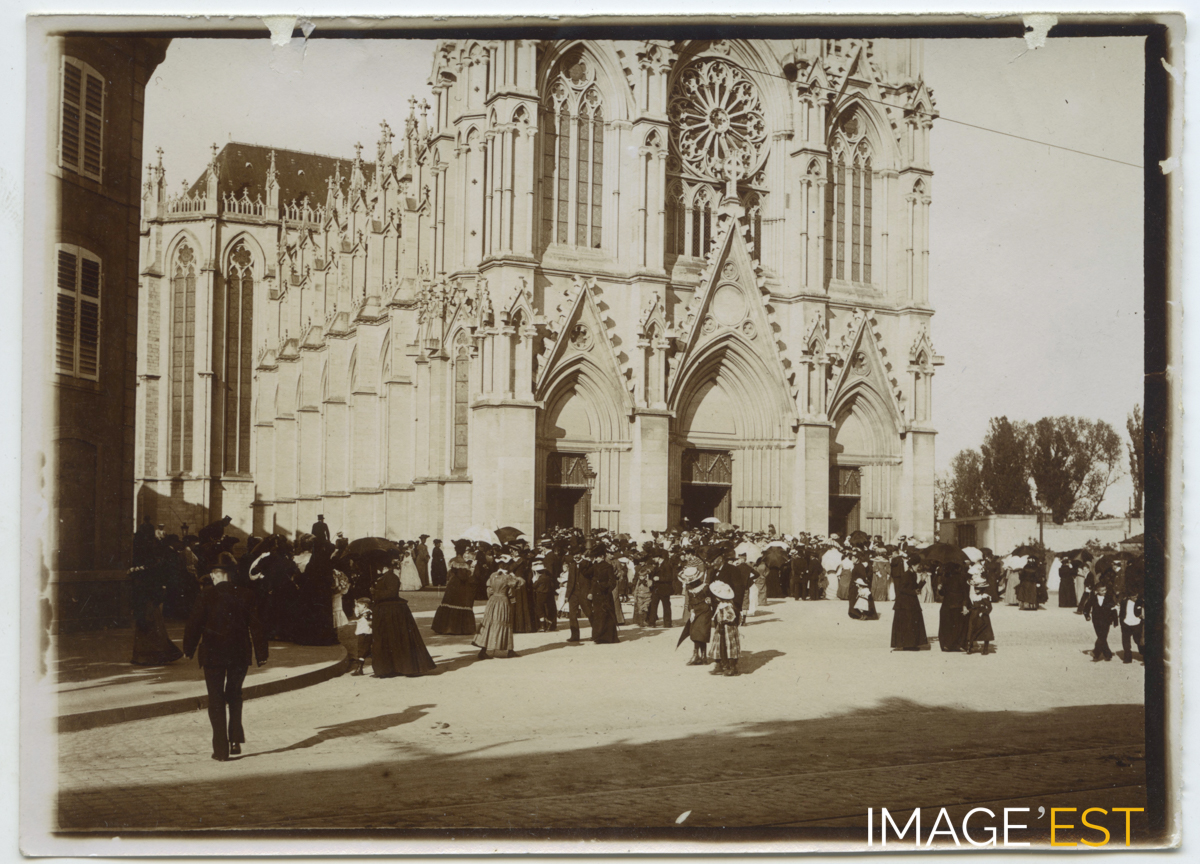 Foule rassemblée devant l'entrée de l'église Saint-Pierre à Nancy (Meurthe-et-Moselle) le 15 mai 1904. Une mention manuscrite au verso de cette photographie précise : " J.Z. - 365 - 15 mai 1904 - La 1ère Communion à St Pierre - Soleil vif direct vers 5 h - D-20 - P.I - 1/60 - NANCY - 59 ".