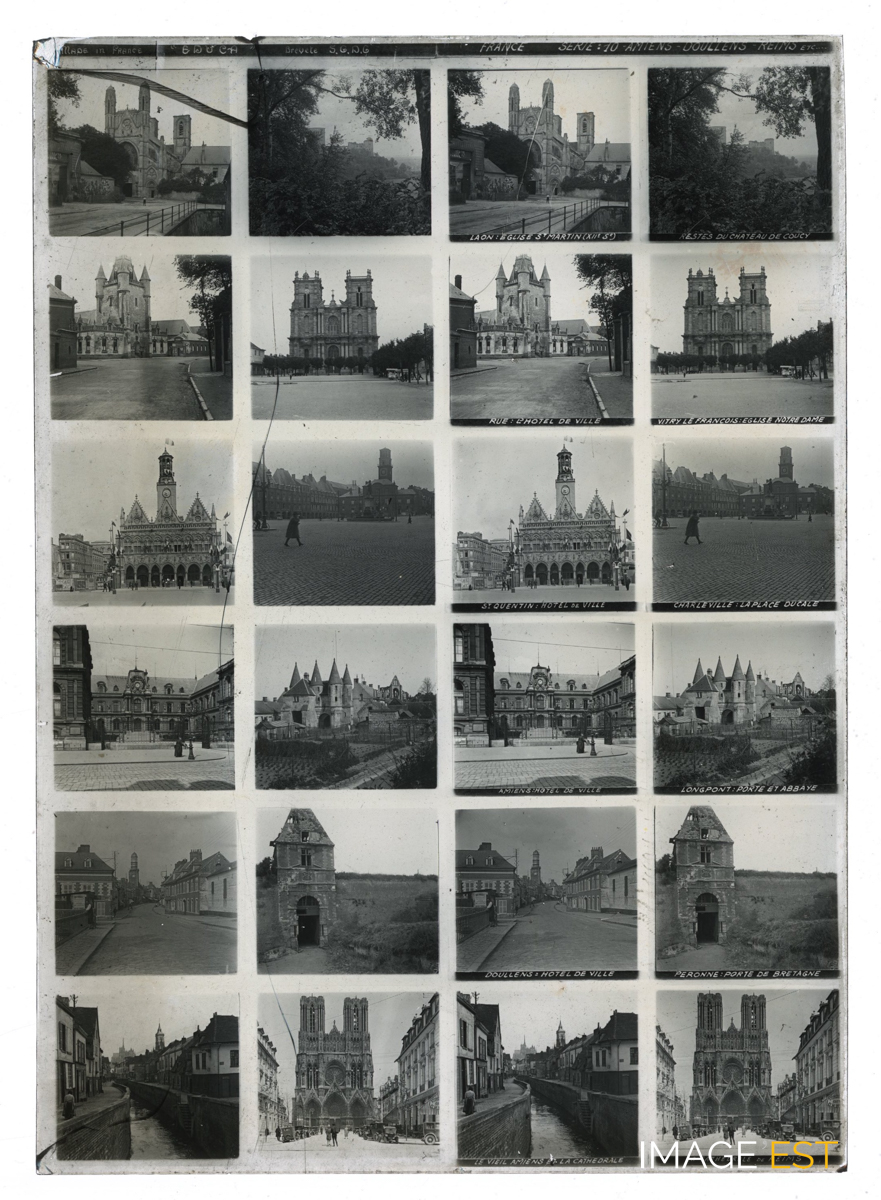 Série de 24 vues montrant des églises, hôtel-de-ville, place et portes de ville. Une mention manuscrite en haut de la plaque indique : " Made in France " Educa " - Breveté S.G.D.G France Série 10 : Amiens - Doullens - Reims etc? ". Une annotation figure sous certaines vues : " Laon : église St-Martin (XIIe Se) - Restes du château de Coucy - Rue : l'hôtel de ville - Vitry-le-François : église Notre-Dame - St-Quentin : hôtel de ville - Charleville : la place ducale - Amiens : hôtel de ville - Longpont : porte et abbaye - Doullens : hôtel de ville - Peronne : porte de Bretagne - Le vieil Amiens et la cathédrale - La cathédrale de Reims ". Il pourrait s'agir d'une plaque destinée à être visionnée dans le domaine de l'Education. (Ecole de Danne et Quatre vents (Moselle). Sur chaque plaque de verre, on trouve deux colonnes doubles de six photographies stéréoscopiques placées en rangée. Concernant les plaques stéréoscopiques, on peut s'interroger sur la nature des représentations véhiculées par l'intermédiaire de la collection la plus diffusée, à savoir la Géographie illustrée de la France. Chaque vue stéréoscopique possède sa propre légende inscrite dans la partie inférieure, et chaque plaque intègre en son milieu son numéro de série et son intitulé. (Source : Nicolas Le Guern, « La stéréoscopie dans les salles de classe. Le cas du stéréoscope Educa dans la France de l'entre-deux-guerres », Transbordeur [En ligne], 8 | 2024, mis en ligne le 15 février 2025, consulté le 28 octobre 2025. URL : http://journals.openedition.org/transbordeur/1456 ; DOI : https://doi.org/10.4000/12gy7).