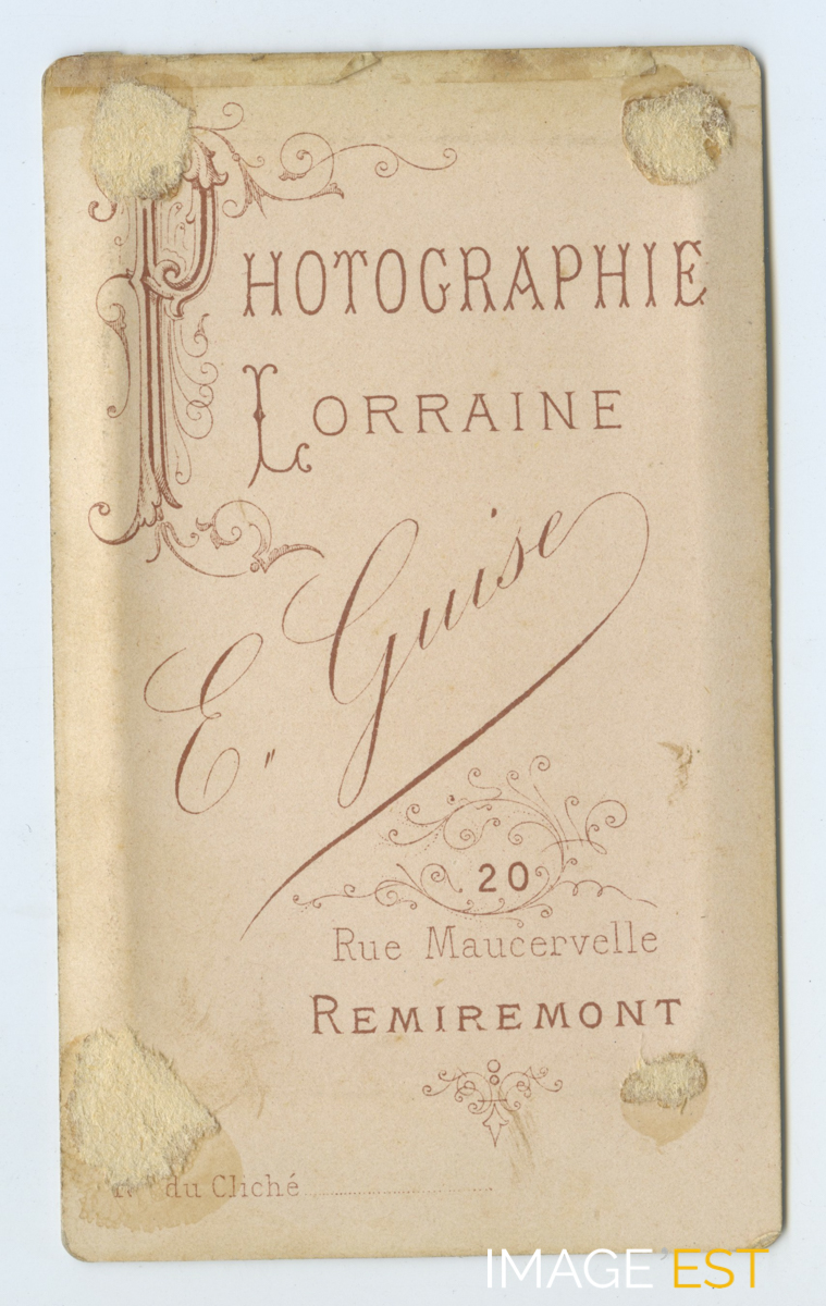 Portrait-carte de visite du photographe Émile Guise (1840-1897), installé 20, rue Maucervelle à Remiremont (Vosges). Cette photographie est extraite d'un album contenant des portraits de nombreux prêtres ayant exercés dans le département des Vosges entre 1870 et 1910 environ.
