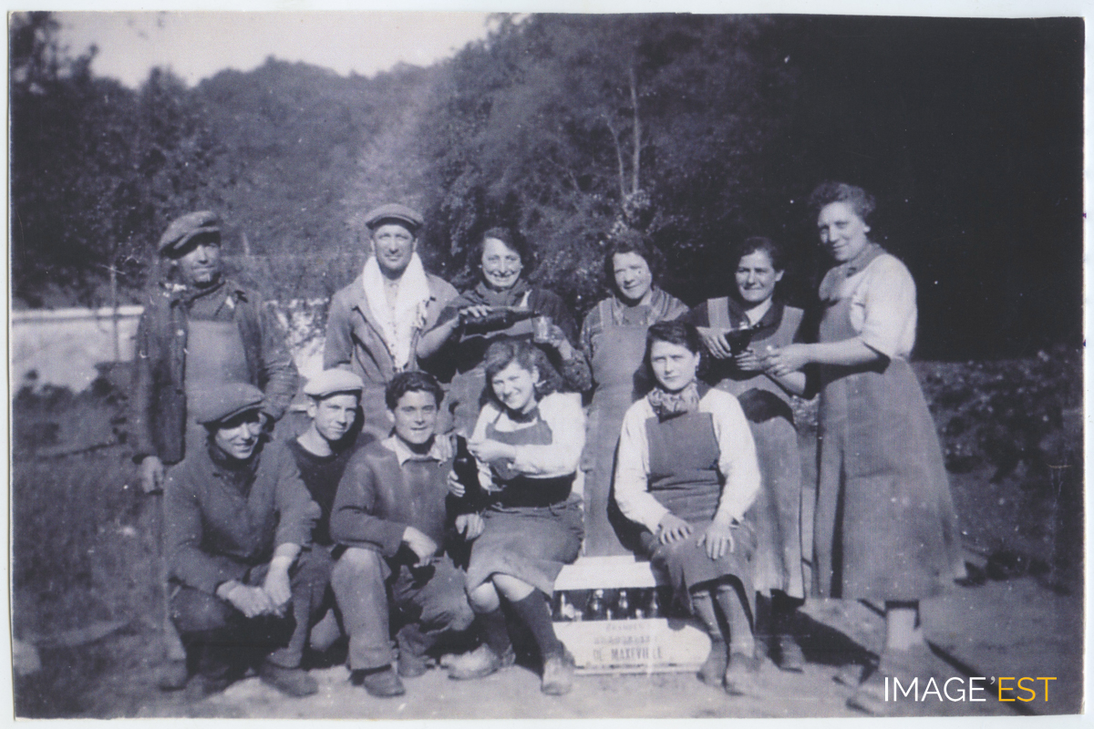 Un groupe d'employe?s des brasseries dans un verger a? l'arrie?re de la malterie à Maxéville (Meurthe-et-Moselle).