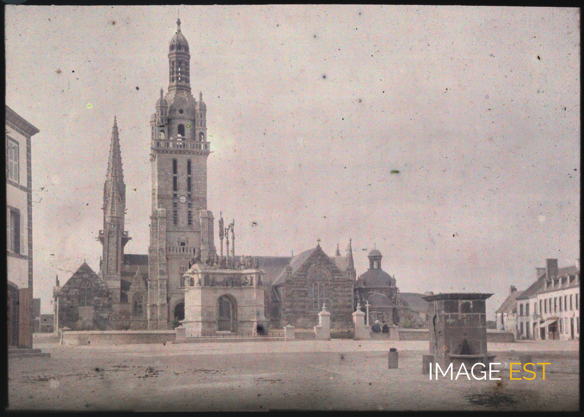 Enclos paroissial de Pleyben (Finistère) constitué de l'église Saint-Germain, l'ossuaire et le calvaire. Aucune mention manuscrite en marge de la plaque de verre autochrome.