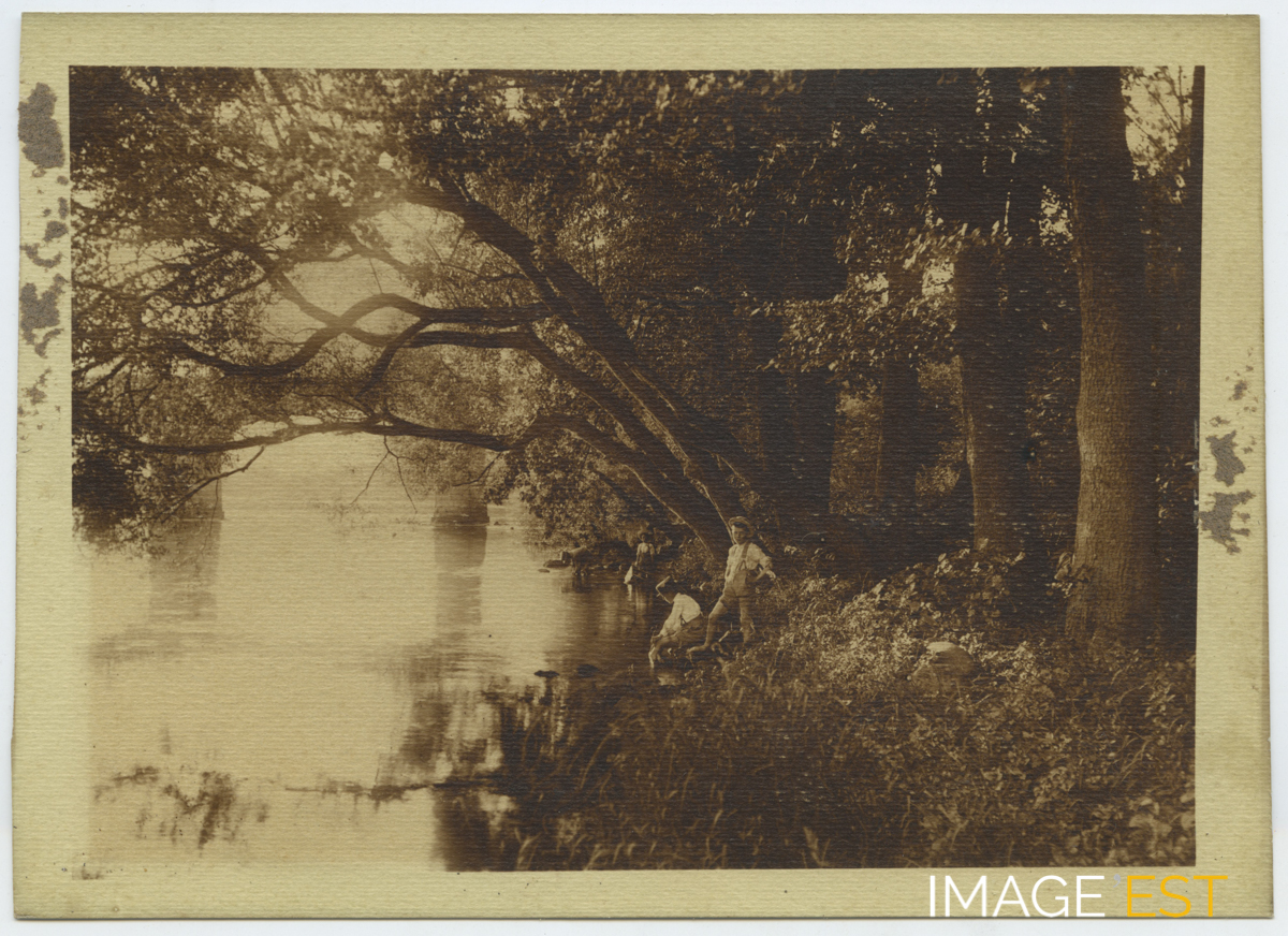 Enfants au bord d'un cours d'eau probablement dans le département des Vosges. Cette photographie est extraite d'un album en cuir repoussé comprenant un ensemble de 48 photographies (format 13 x 18 cm), noir et blanc, illustrant les loisirs et la vie d'une famille aisée probablement dans le département des Vosges à la fin du XIXe ou au début du XXe siècle.
