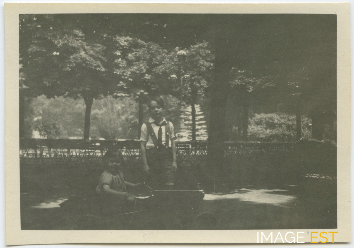 Enfants jouant avec une automobile à pédales dans une allée du parc de la Pépinière à Nancy (Meurthe-et-Moselle).