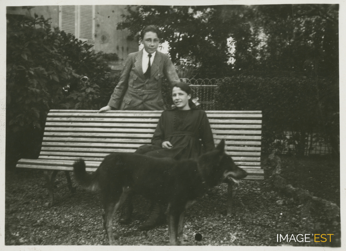 Les enfants de Charles et Berthe Kalis : Robert (1902-1960), futur avocat, et Geneviève, dans le jardin de la demeure familiale au 5, avenue Georges Clemenceau à Nancy (Meurthe-et-Moselle), construite en 1911 par Fernand César (1879-1969) architecte DPLG de l'École de Nancy. (Source : Archives privées des familles Kalis-Moreau).