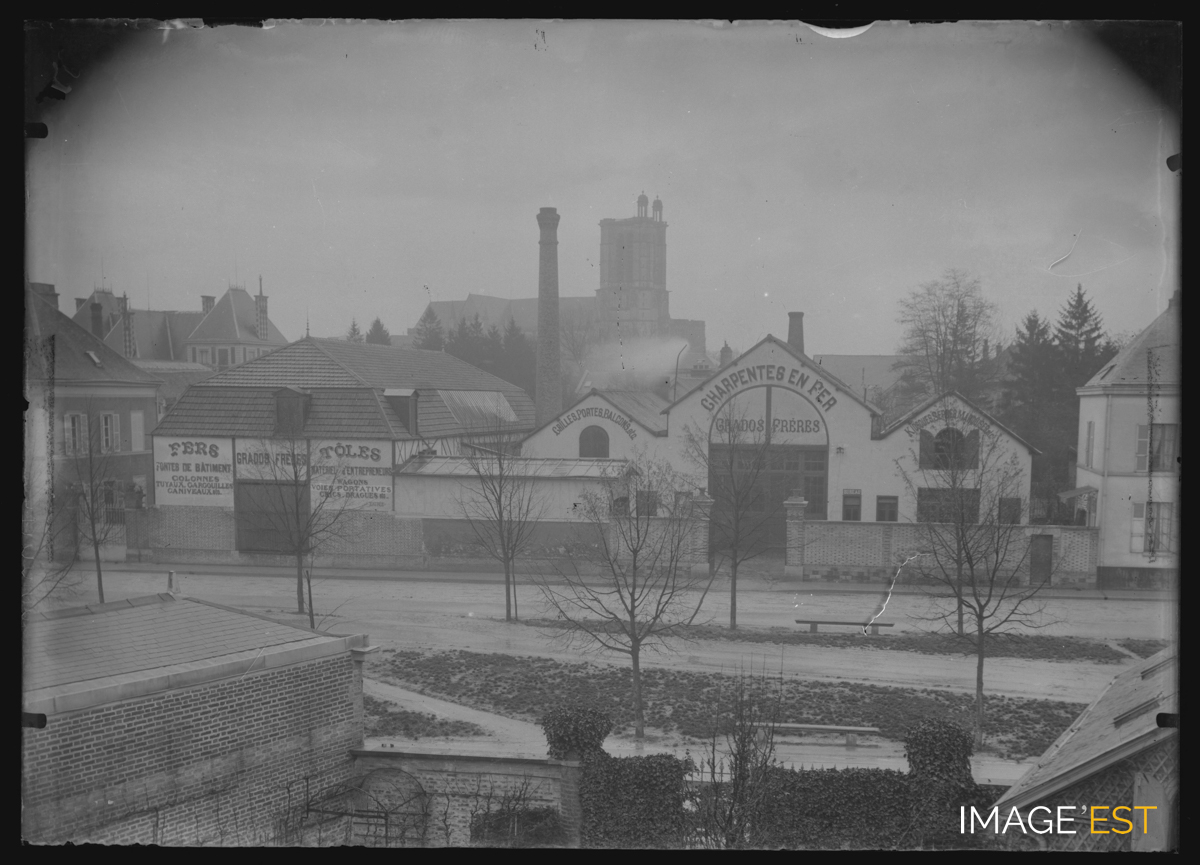 Vue de l'entreprise Grados Frères, fabriquant de fer, tôles, charpente, grilles, portes? À l'arrière-plan se dessine une cathédrale.