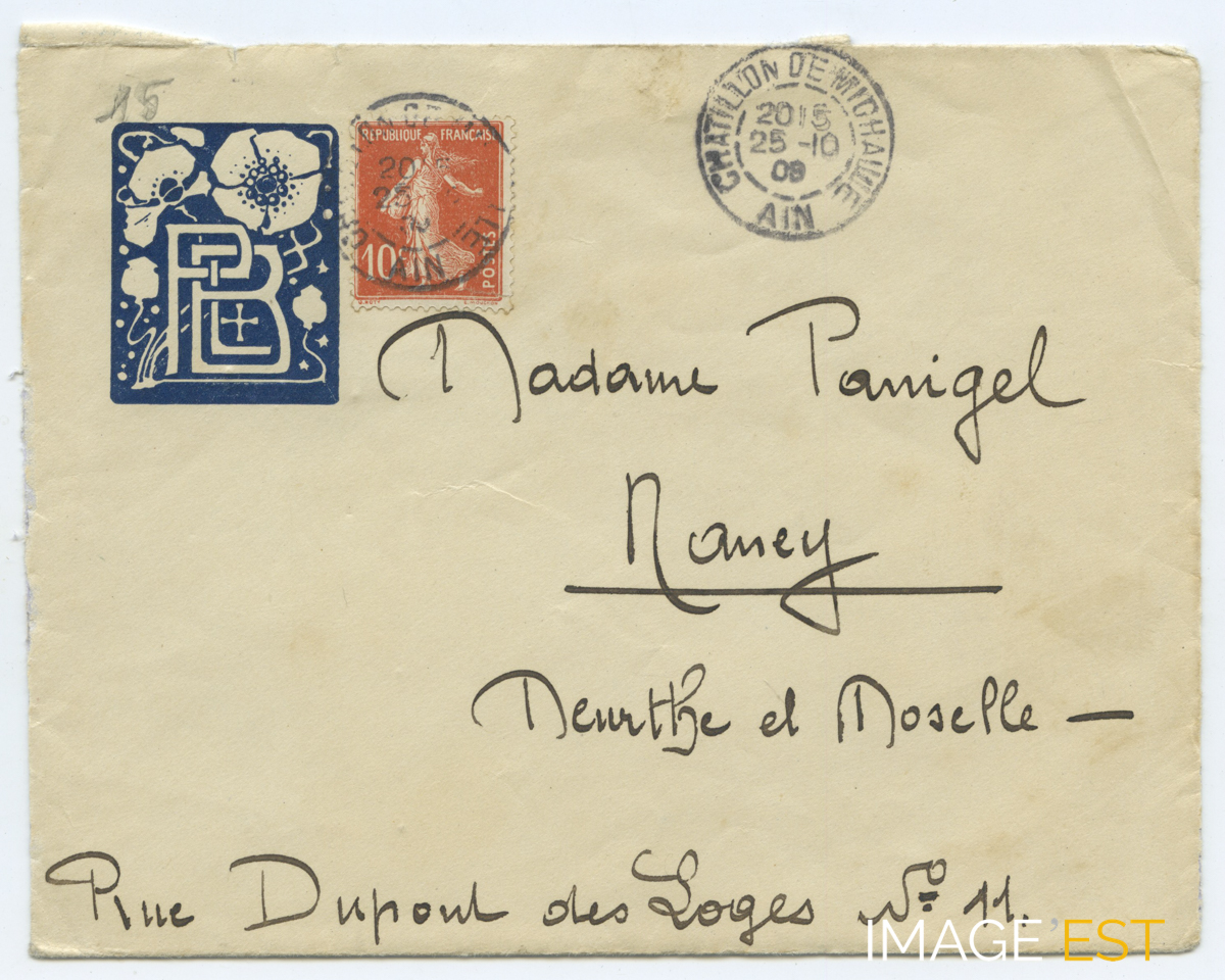 Enveloppe à l'en-tête du monogramme de Paul Beyer, céramiste, peintre verrier, adressée à madame Panigel 11, rue Dupont des Loges à Nancy (Meurthe-et-Moselle). Le patronyme " Panigel " pourrait avoir été confondu avec celui de " Panigot " puisqu'il s'agit de la même adresse.