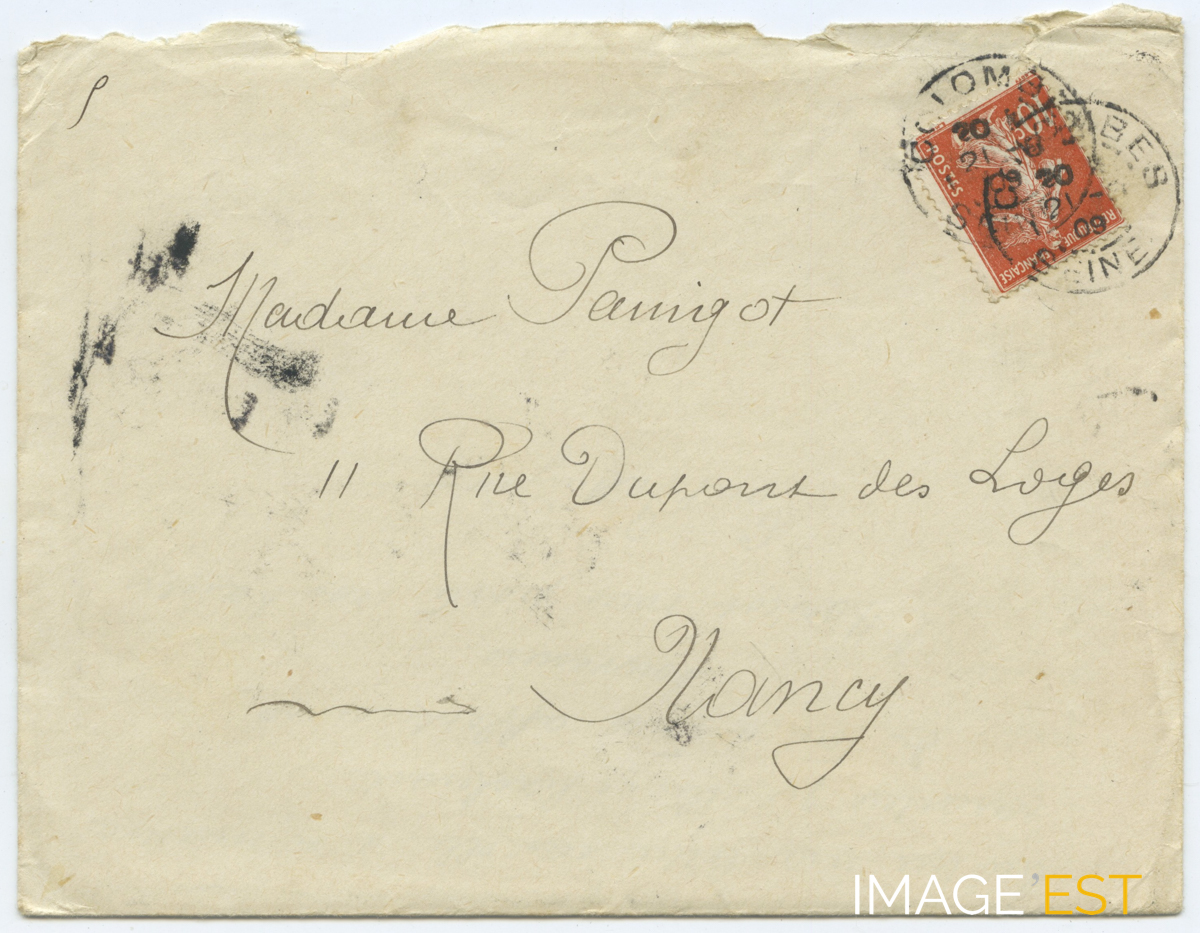 Enveloppe destinée à madame Octavie Panigot, domiciliée " 11 rue Dupont des Loges à Nancy (Meurthe-et-Moselle).