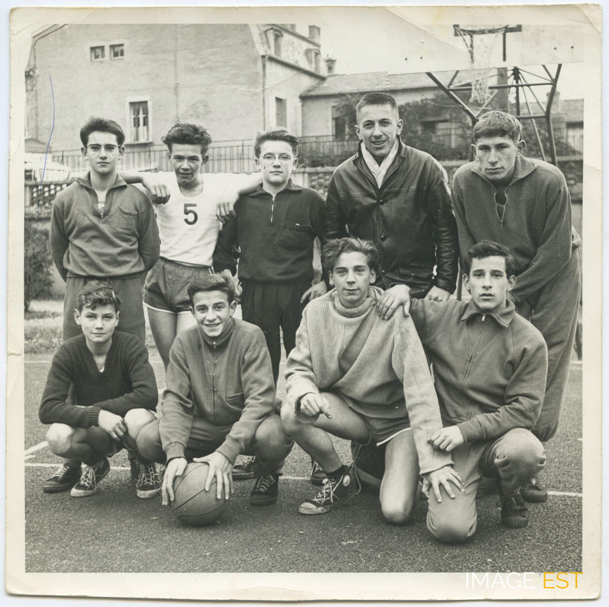 Équipe de basket-ball de l'USM dans le parc de la mairie à Maxéville (Meurthe-et-Moselle). Au verso, les noms de différents joueurs : " Ruvéra-Mattrel-Ricci-Naumann-Chevrier-Gadel-Klaine-Busy-Ferari " et la date " 12/11/61".