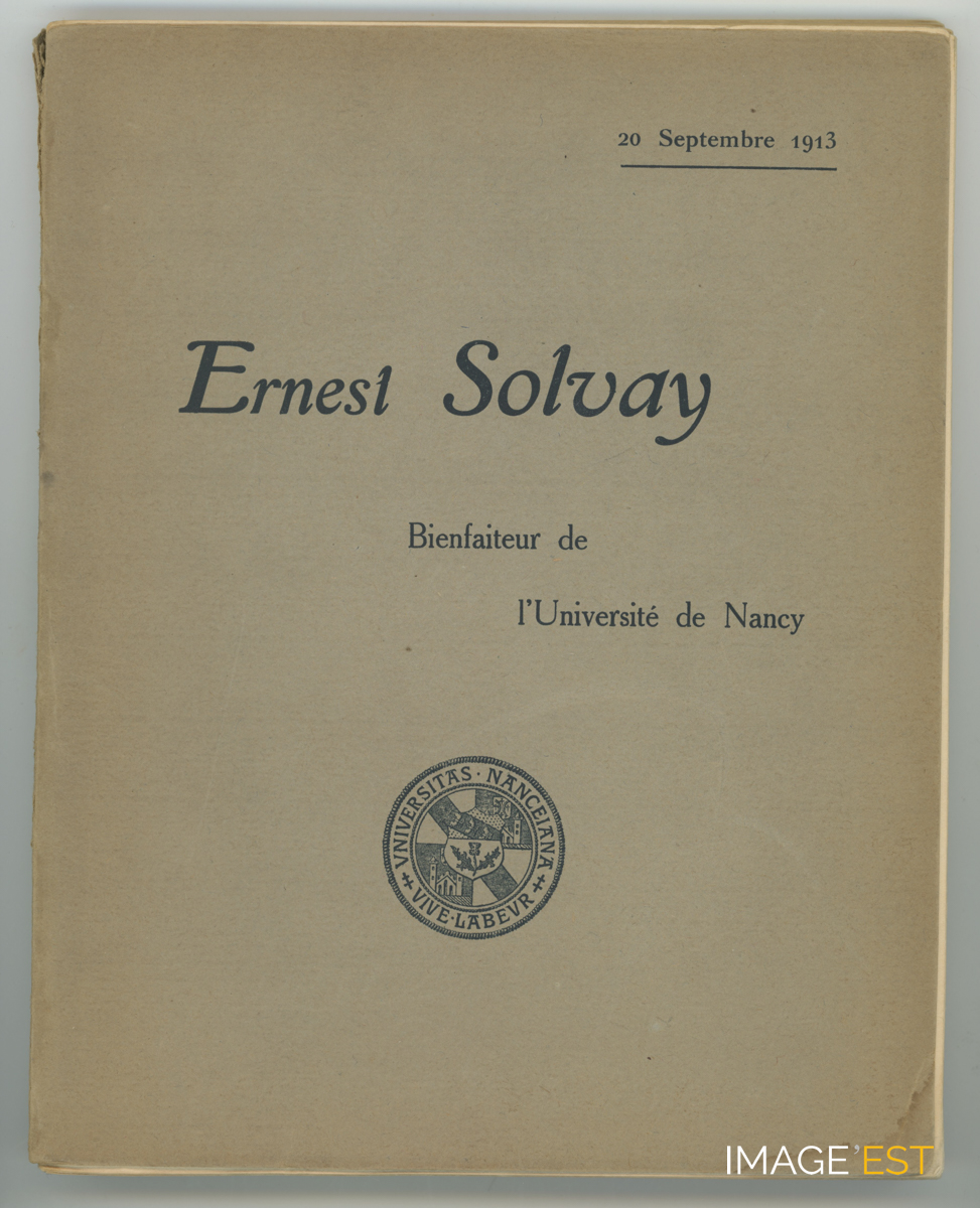 Brochure intitulée " Ernest Solvay. Bienfaiteur de l'Université de Nancy - 20 septembre 1913 " comprenant un portrait de Ernest Solvay pris par le photographe Alexandre, plusieurs planches hors-texte en héliogravure de l'Institut chimique de Nancy, la liste des promotions des chimistes et ingénieurs-chimistes de Nancy (ICN) de 1891 à 1913, des docteurs ès-sciences, les prix décernés par l'Académie des Sciences de 1896 à 1911) et l'Académie royale de Stockholm (1912). De précieuses informations sont contenues à propos de l'historique de l'Institut électrotechnique et de mécanique appliquée, créé par Bichat : " Le début remonte à 1896 ; ce fut un simple cours d'électricité industrielle ". En 1898, l'Institut bénéficie de 100 000 francs versés par E. Solvay. Après le décès de Bichat, le 26 juillet 1905, Henri Vogt prend le relais. L'Institut de mécanique appliquée y est développé avec deux grands laboratoires : " Cet imposant ensemble jusqu'à présent unique en France, fut inauguré le 13 juin 1909 ". L'Institut Chimique avec l'Électro-Chimie, l'Institut Électrotechnique avec la Mécanique appliquée, sont les deux oeuvres maîtresses de l'Université de Nancy. Ernest Solvay en a été le principal fondateur. Il apparaît comme un généreux donateur dans la création d'autres institutions comme l'Institut sérothérapique, l'École supérieure de pharmacie, l'Institut de géologie, créé en 1910.