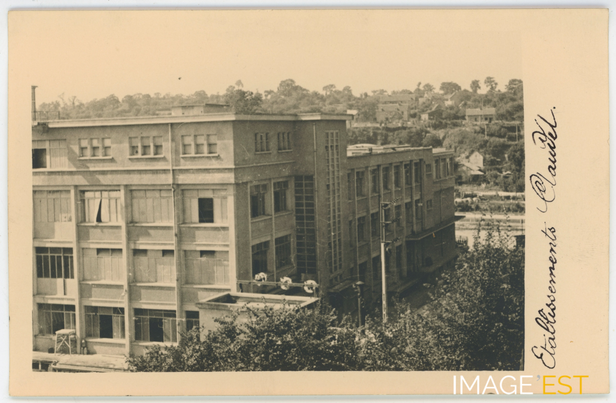Façade des établissements Claudel. Il pourrait s'agir de l'usine Claude à La Meauffe (Manche). Un article du journal Ouest- France apporte quelques précisions : " L'histoire de l'usine Claudel, à La Meauffe - Rampan - Pont Hébert, commence en 1912, avec l'arrivée en Normandie d'un Vosgien, Henri Claudel. À l'ouverture de l'usine, le 17 septembre 1912, le ramassage du lait effectué avec une charrette est de 70 l. Deux mois plus tard, il atteint 3 000 l. " (Source : https://www.ouest-france.fr/normandie/pont-hebert-50880/une-exposition-sur-l-usine-claudel-en-projet-4815180)