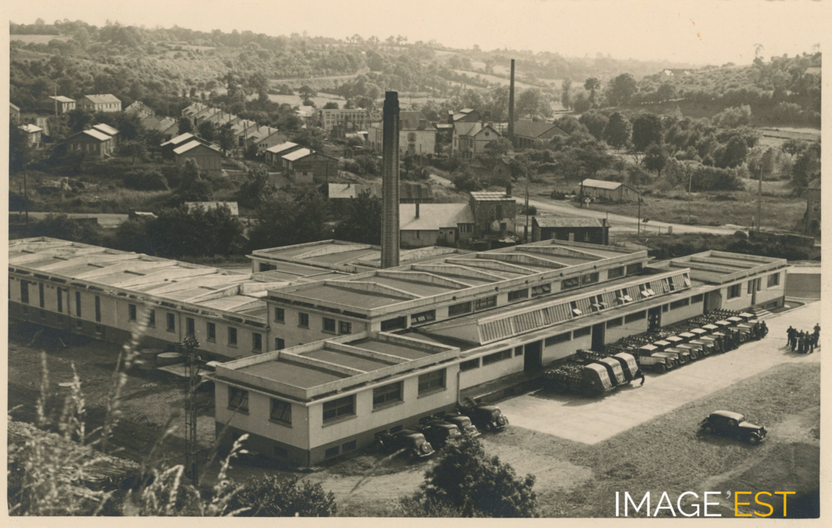 Vue aérienne des établissements Claudel. Il pourrait s'agir de l'usine Claude à La Meauffe (Manche). Un article du journal Ouest-France apporte quelques précisions : " L'histoire de l'usine Claudel, à La Meauffe - Rampan - Pont Hébert, commence en 1912, avec l'arrivée en Normandie d'un Vosgien, Henri Claudel. À l'ouverture de l'usine, le 17 septembre 1912, le ramassage du lait effectué avec une charrette est de 70 l. Deux mois plus tard, il atteint 3 000 l. " (Source : https://www.ouest-france.fr/normandie/pont-hebert-50880/une-exposition-sur-l-usine-claudel-en-projet-4815180)