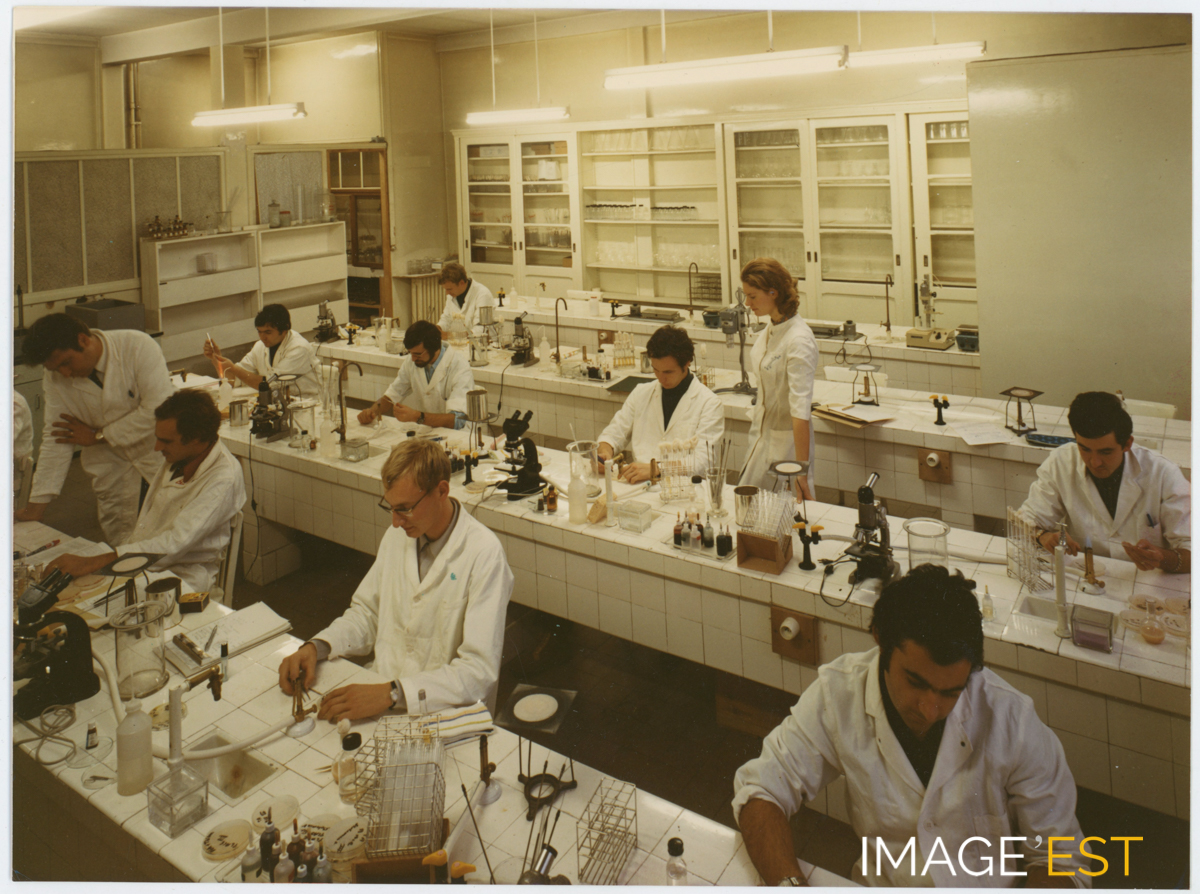 Étudiants de l'Ensaia (École nationale supérieure d'agronomie et des industries alimentaires) en travaux pratiques dans une salle d'un bâtiment, rue Sainte-Catherine à Nancy (Meurthe-et-Moselle). Au verso de ce tirage figure le cachet du photographe nancéien Charles André (17 - 5841).