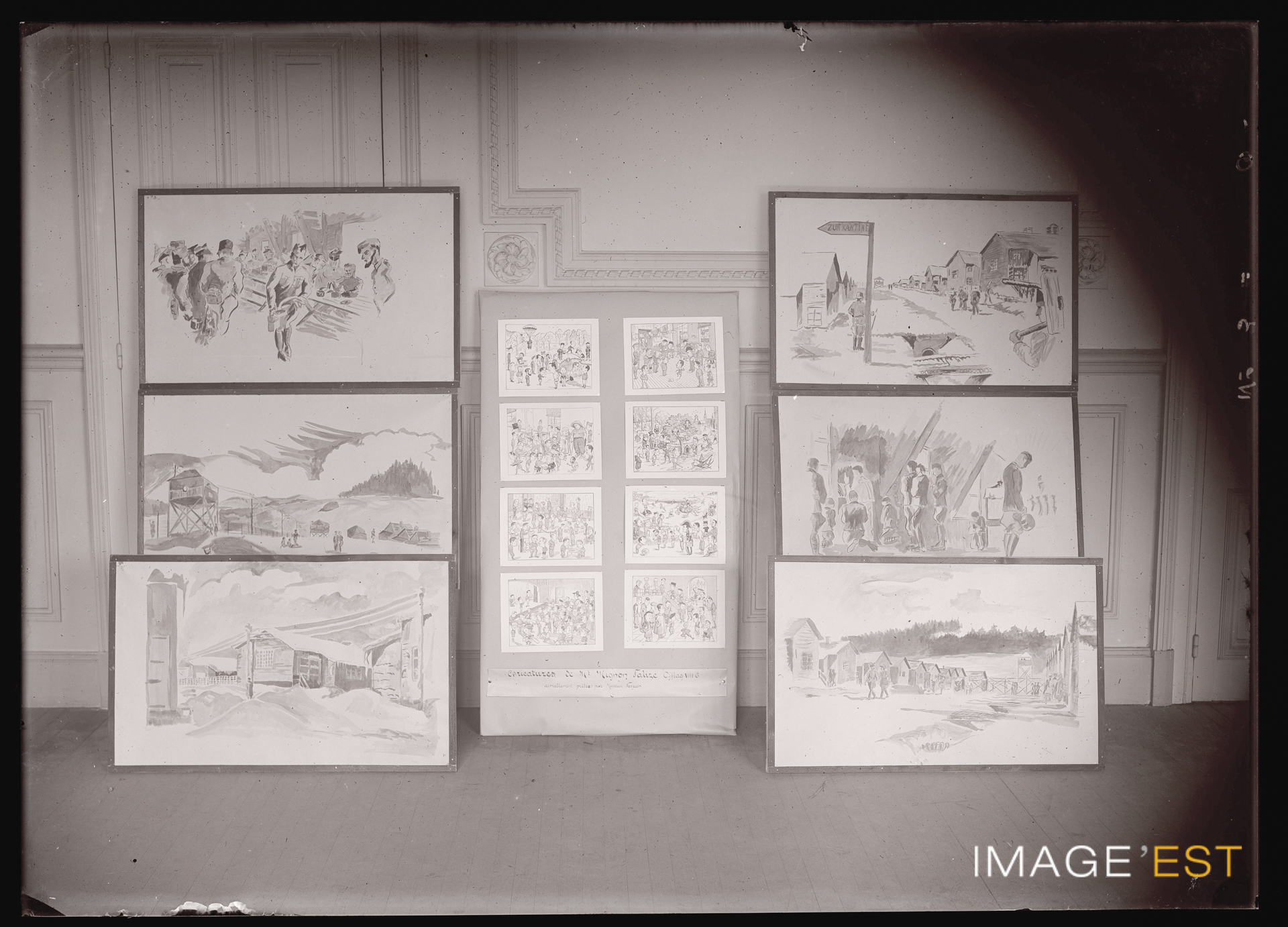 Dessins et caricatures présentés lors d'une exposition de la Croix-Rouge française et du " Comité central d'assistance " du Val-d'Ajol (Vosges) aux prisonniers de guerre, présentée probablement dans une salle de l'Hôtel de ville du Val-d'Ajol (Vosges). Sur le panneau central figure la mention manuscrite : " Caricatures de M. Mignon Falize - Offlag VIII G - aimablement prêtées par Monsieur Nosjean "