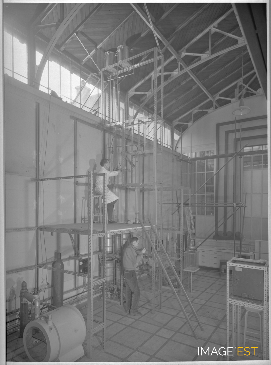 Salle d'extaction continue de l'École nationale supérieure des industries chimiques (ENSIC) à Nancy (Meurthe-et-Moselle). Une mention manuscrite au verso précise : " Extraction continue liquidie-liquide ".