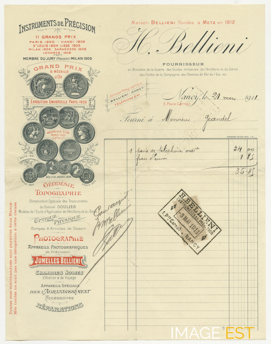 Facture à en-tête de la célèbre Maison Bellieni, fondée à Metz (Moselle) en 1812, et installée à Nancy (Meurthe-et-Moselle) après la Guerre franco-allemande de 1870-1871 au 17, puis au 1, place Carnot. Spécialisée dans la conception de matériels optiques et photographiques, l'établissement était un important " fournisseur du Ministère de la Guerre, des Écoles militaires, de l'Artillerie et du Génie, des Forêts, de la Compagnie des Chemins de Fer de l'Est, etc. " Cette facture, en date du 21 mars 1911, est adressée à un certain M. Jeandel (rue du Pont-Mouja, Nancy). On remarquera à gauche les prix et médailes récompensant l'établssement. L'une des plus anciennes date de 1861 (Exposition universelle - Agriculture, Industrie, Beaux-Arts - Metz).