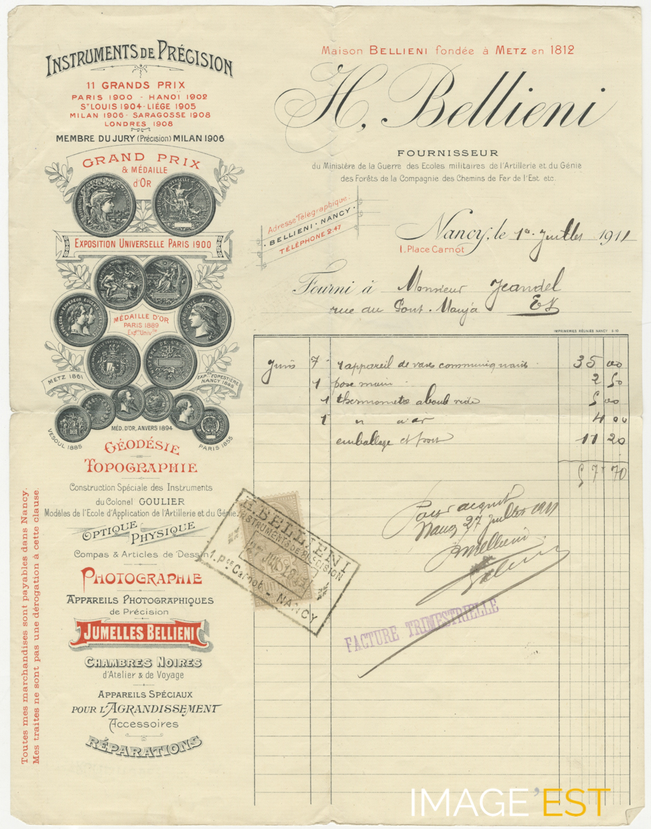 Facture à en-tête de la célèbre Maison Bellieni, fondée à Metz (Moselle) en 1812, et installée à Nancy (Meurthe-et-Moselle) après la Guerre franco-allemande de 1870-1871 au 17, puis au 1, place Carnot. Spécialisée dans la conception de matériels optiques et photographiques, l'établissement était un important " fournisseur du Ministère de la Guerre, des Écoles militaires, de l'Artillerie et du Génie, des Forêts, de la Compagnie des Chemins de Fer de l'Est, etc. " Cette facture, en date du 1er juillet 1911, est adressée à un certain M. Jeandel (rue du Pont-Mouja, Nancy). On remarquera à gauche les prix et médailes récompensant l'établssement. L'une des plus anciennes date de 1861 (Exposition universelle - Agriculture, Industrie, Beaux-Arts - Metz).