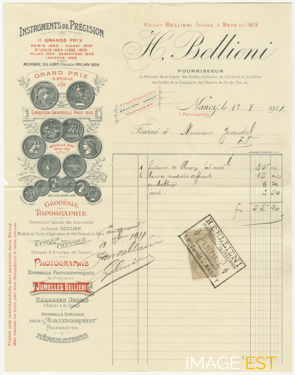 Facture à en-tête de la célèbre Maison Bellieni, fondée à Metz (Moselle) en 1812, et installée à Nancy (Meurthe-et-Moselle) après la Guerre franco-allemande de 1870-1871 au 17, puis au 1, place Carnot. Spécialisée dans la conception de matériels optiques et photographiques, l'établissement était un important " fournisseur du Ministère de la Guerre, des Écoles militaires, de l'Artillerie et du Génie, des Forêts, de la Compagnie des Chemins de Fer de l'Est, etc. " Cette facture, en date du 17 août 1911, est adressée à un certain M. Jeandel (rue du Pont-Mouja, Nancy). On remarquera à gauche les prix et médailes récompensant l'établssement. L'une des plus anciennes date de 1861 (Exposition universelle - Agriculture, Industrie, Beaux-Arts - Metz).