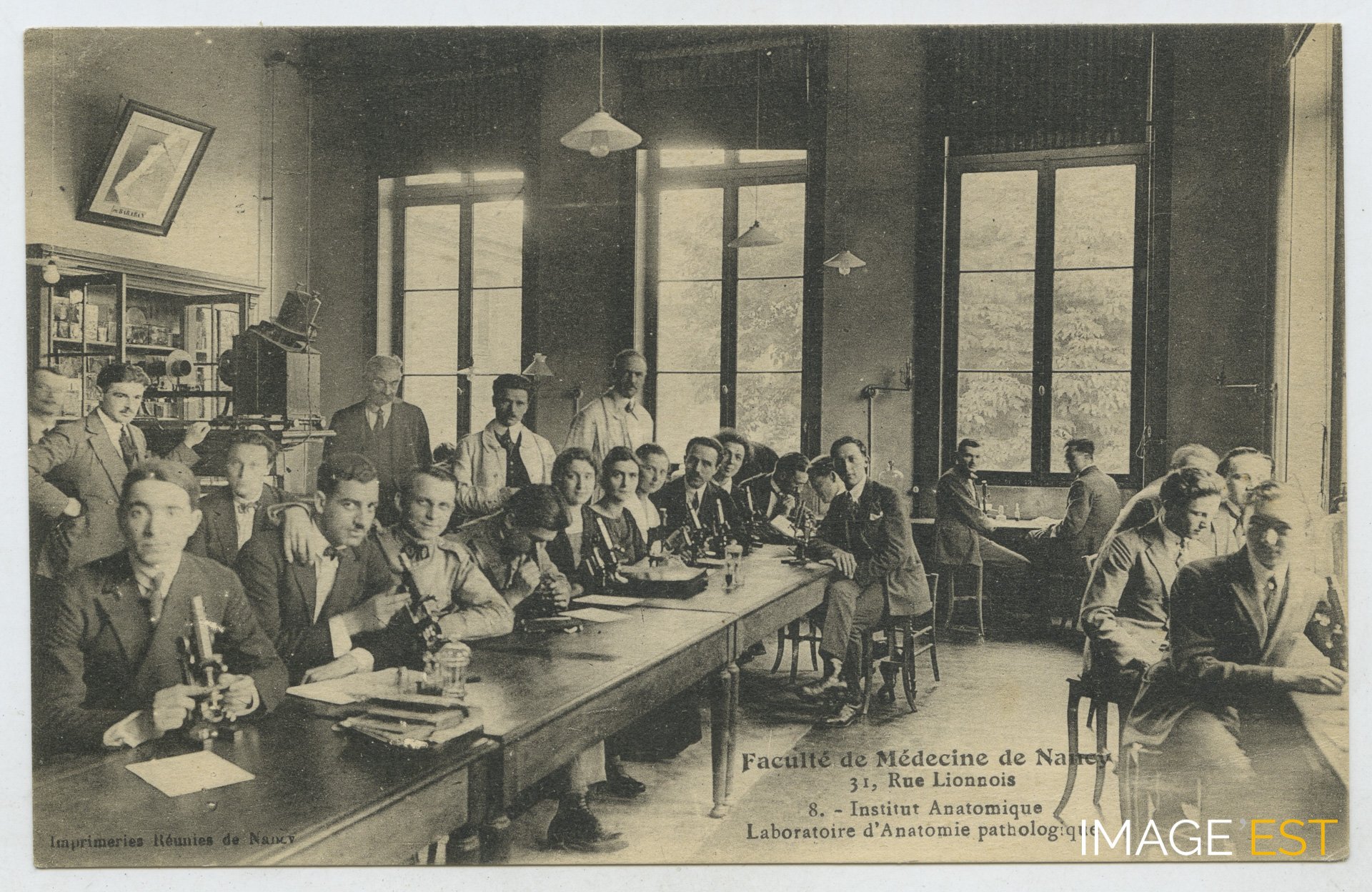 Institut anatomique et laboratoire d'anatomie pathologique de la Faculté de Médecine 30, rue Lionnois à Nancy (Meurthe-et-Moselle). En 1752, un " Collège Royal de Médecine " est inititalement installé rue Sainte Catherine, puis dans le pavillon ouest de la place Stanislas (actuel Musée des Beaux-Arts). Après le transfert de la Faculté de Pont-à-Mousson à Nancy en 1768, la Faculté est bien accueillie par le Collège dans son pavillon de la place Royale avant de s'installer dans ses propres locaux place de Grève (actuelle Bibliothèque Municipale). Si tous les établissements de Médecine sont supprimés avec la Révolution, il faudra attendre 1872 et cette fois, le transfert à Nancy de la Faculté de Médecine de Strasbourg avec l'Ecole Supérieure de Pharmacie. La nouvelle Faculté est inaugurée le 19 novembre 1872 après son installation dans les locaux de l'École Préparatoire de Médecine vite trop exigus, puis dans les nouveaux bâtiments de la rue Lionnois (http://www.professeurs-medecine-nancy.fr/breve_histoire_medecine_Nancy.htm). Cette carte porte une mention au dos : " XVIIIe Congrès Français de Médecine - Nancy, 16, 17, 18 juilet 1925 - Offert par Hémoglobine Deschiens ".