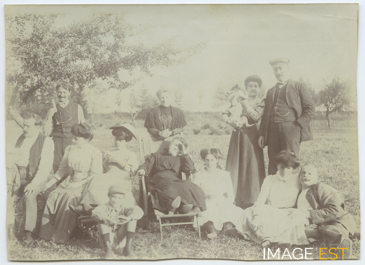 Famille à la campagne probablement dans le département des Vosges. Cette photographie est extraite d'un album en cuir repoussé comprenant un ensemble de 48 photographies (format 13 x 18 cm), noir et blanc, illustrant les loisirs et la vie d'une famille aisée probablement dans le département des Vosges à la fin du XIXe ou au début du XXe siècle.