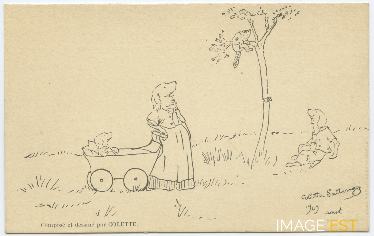 Reproduction en carte postale d'un dessin signé et réalisé par l'illustratrice Colette Pattinger (1896-1940?), représentant un couple de chiens et leur petit dans une poussette. Ils regardent un chat agrippé à une branche d'arbre. Sur la carte, figure la signature manuscrite : " Colette Pattinger 1909 août ", ainsi que l'inscription " Composé et dessiné par COLETTE ".