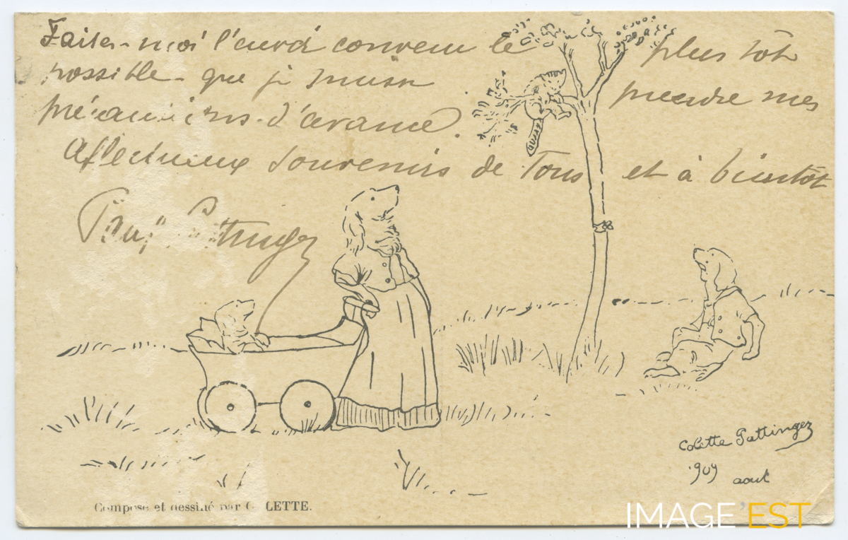Dessin anthropomorphique réalisé par l'illustratrice Colette Pattinger (1896-1940?), représentant une famille de chien. Sur la carte, figure la signature de Colette Pattinger et la date " 1909 août ", ainsi que l'inscription " Composé et dessiné par COLETTE ". Paul Pattinger achève sa correspondance avec madame Panigot sur cette illustration.