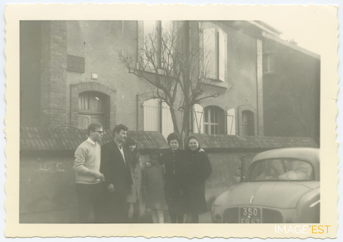 Famille Gaspard devant une automobile Dauphine au 28, rue Pasteur aux cités Solvay à Maxéville (Meurthe-et-Moselle).