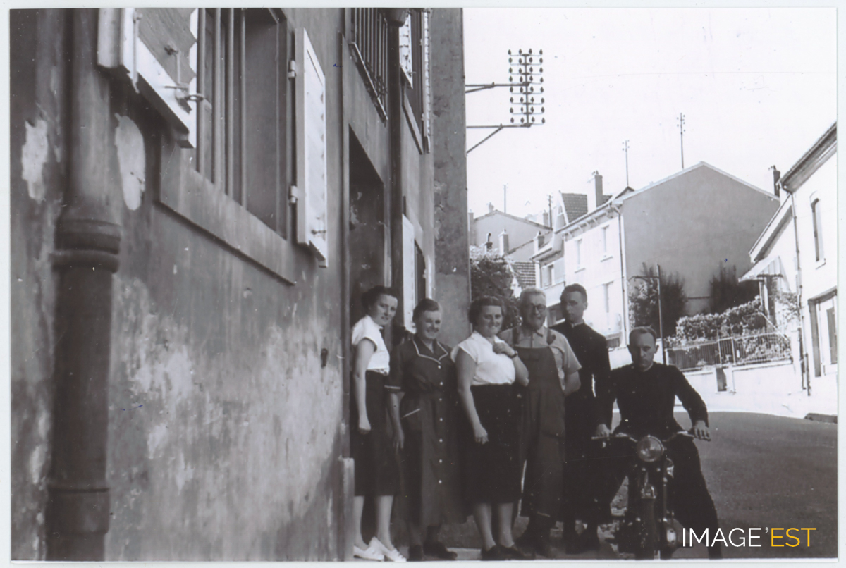 La famille Crouzier devant l'entrée de leur maison, rue Courbet à Maxéville (Meurthe-et-Moselle).