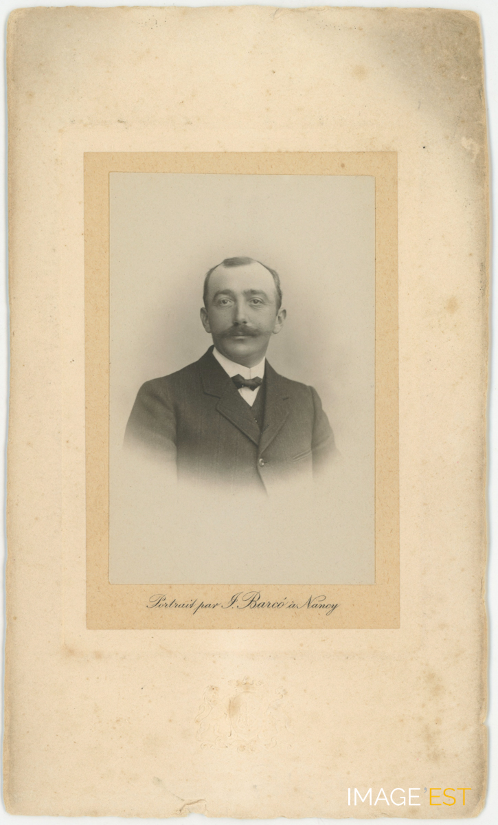 Portrait de Félix Moreau (1876-1948) directeur de la Brasserie de Vézelise (Meurthe-et-Moselle). Photographie contrecollée sur carton, au verso, le tampon du photographe : " Photographie - J. Barco - faubourg Stanislas - Nancy ". (Source : Archives privées des familles Kalis-Moreau).