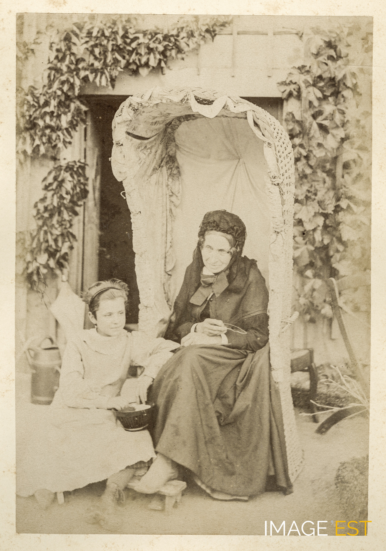 Femme âgée en compagnie d'une jeune fille. Cette photographie est extraite d'un album photographique intitulé, " J. D. " comprenant 71 photographies contrecollées sur carton, prises par le lieutenant-colonel Joseph Jules Delarue (1839-1925), commandant le 50e régiment territorial d'infanterie de Nancy, photographe amateur et membre actif de la prestigieuse Société Lorraine de Photographie (fondée à Nancy en 1894) à laquelle il adhère en 1895 (Bulletin de la Société Lorraine de Photographie, n°3 septembre 1895).